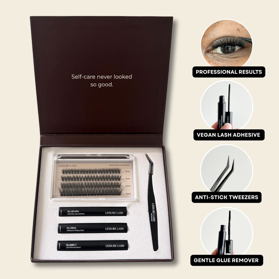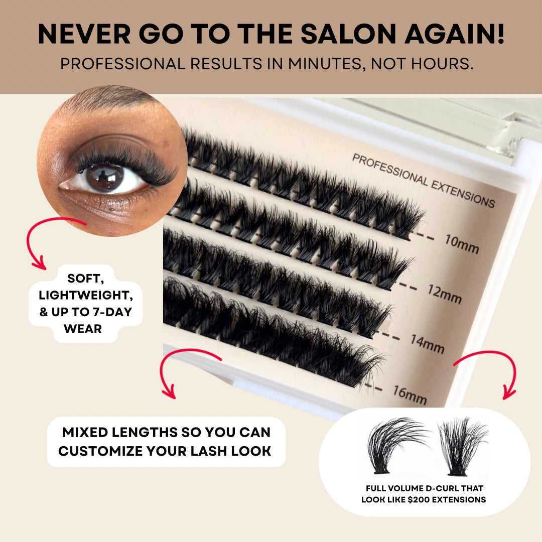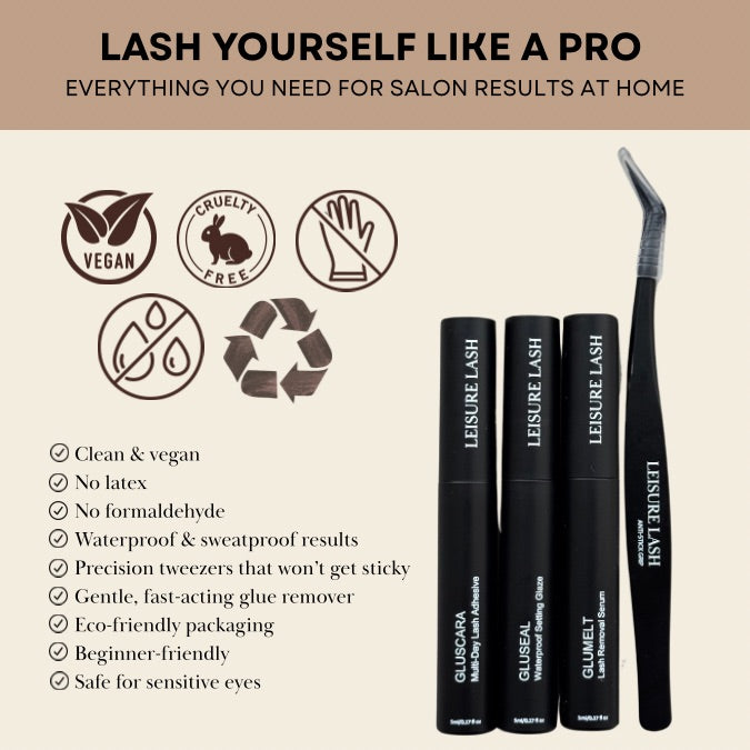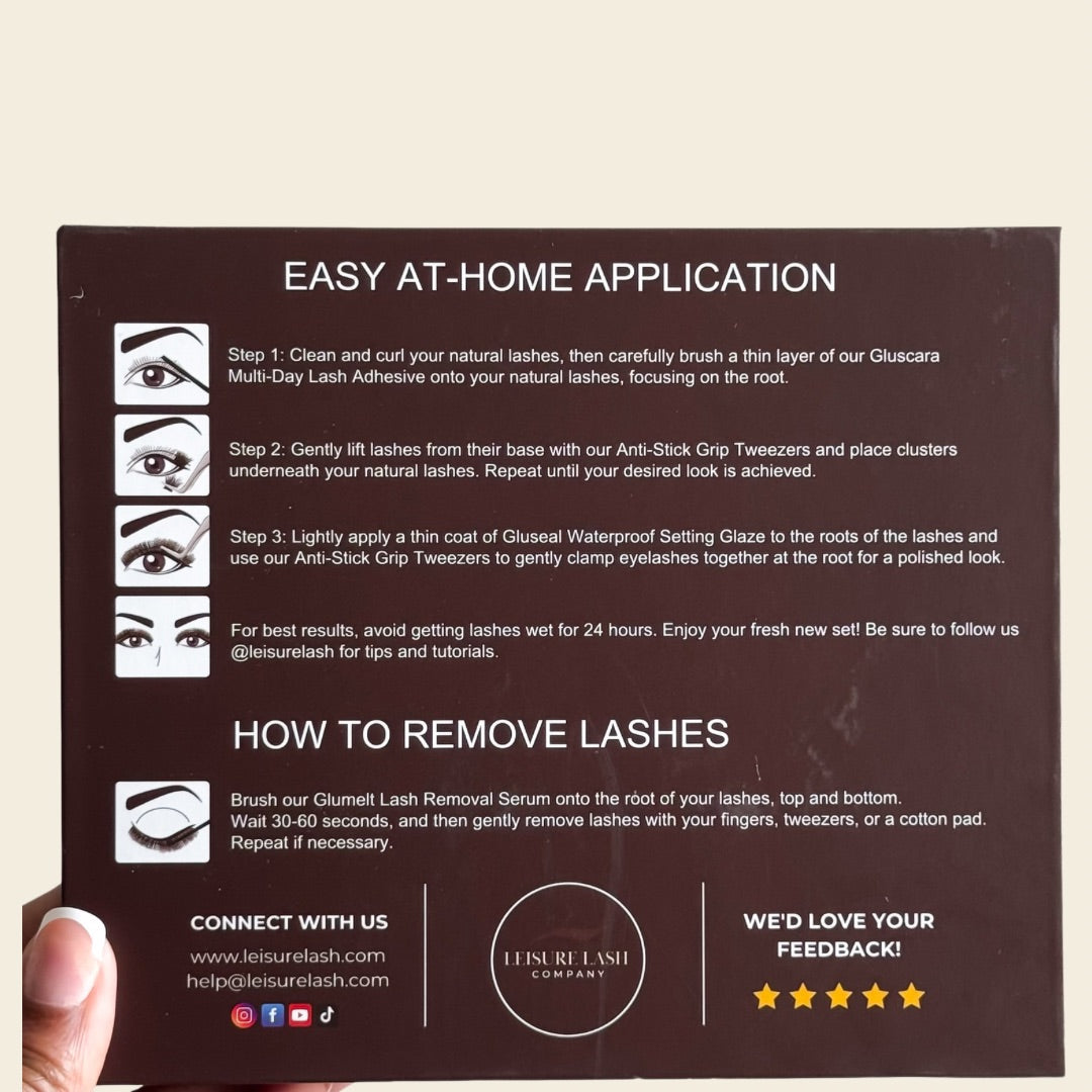 Our kit is designed to give you salon-quality lashes at home with an easy-to-use system. Each kit includes premium lash clusters, precision anti-stick tweezers, and our long-wear adhesive for a seamless one-step application in minutes, whenever and however you want!